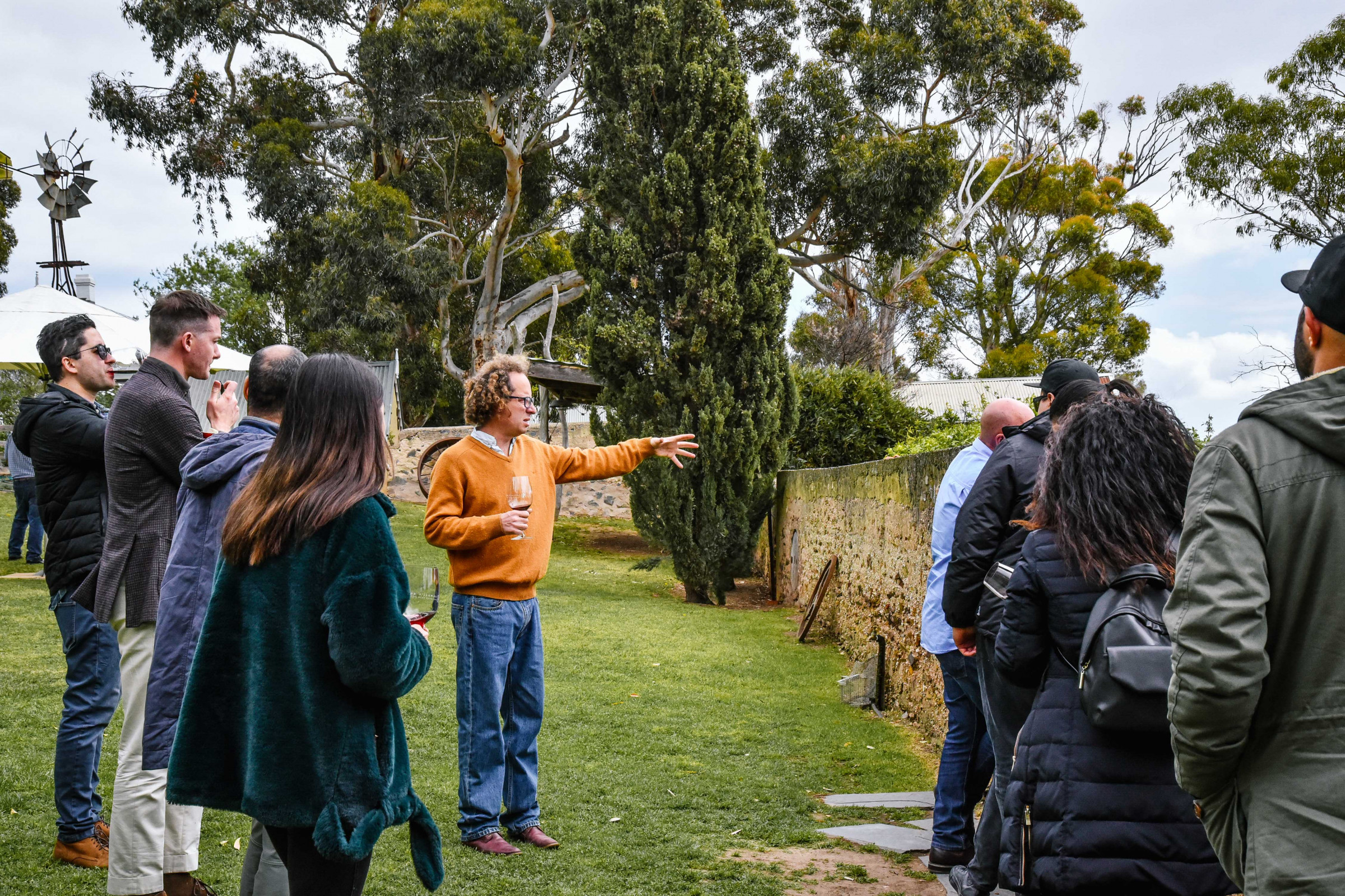 The fact the team here today are experiencing the winery with Justin gives them licence by osmosis to conjure up visions of the same blue sky, the views over the gulf, the century-old stone walls and Onkaparinga River valley that all contribute to making this wine so unique.
