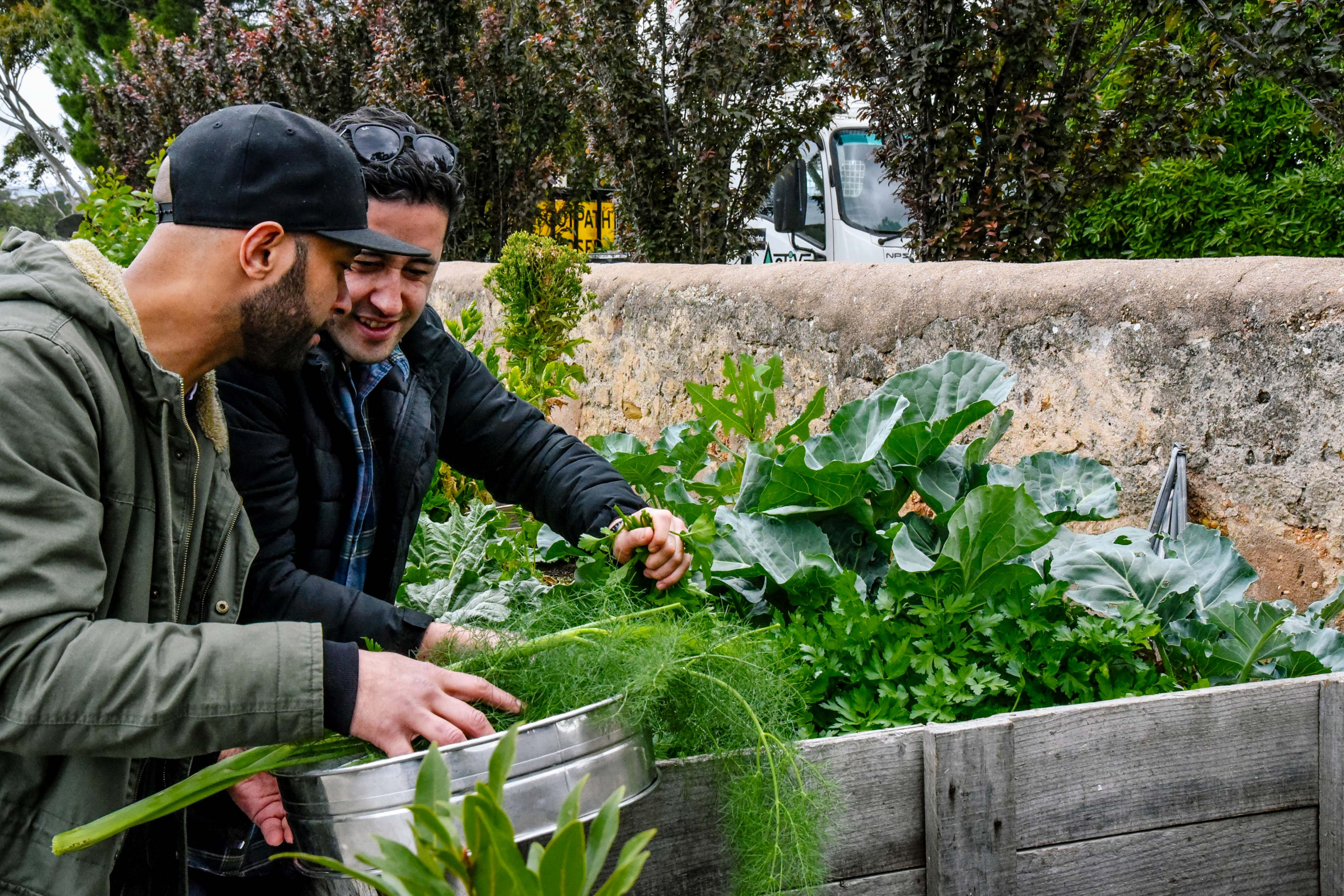 “Are these vine leaves the same as the ones you make dolmades with?” Josh asks Justin as he plucks a vine leaf from the verandah.